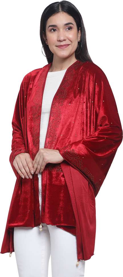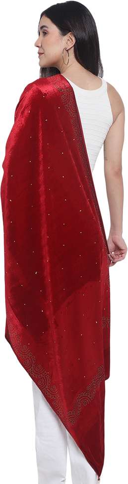Made from premium-quality velvet, offering a soft and velvety touch for unmatched comfort., Delicately woven ladder design border on all four sides, adding grace and refinement., Luxurious Velvet Sarvowski Stole with captivating sarvowski pattern all over., Dimensions: 210 cm (83 inches) x 75 cm (30 inches), providing ample coverage and styling options., Intricate design exuding a radiant sparkle, perfect for special occasions and elegant evenings.